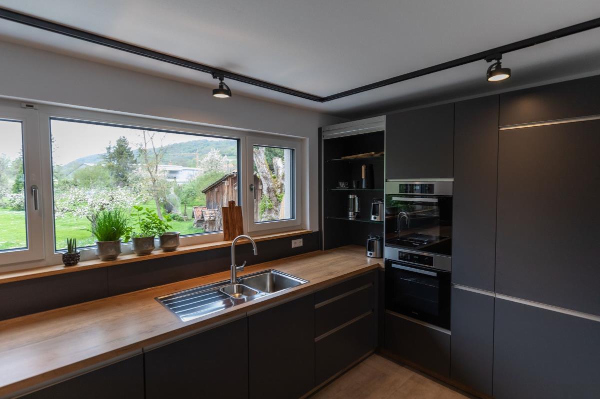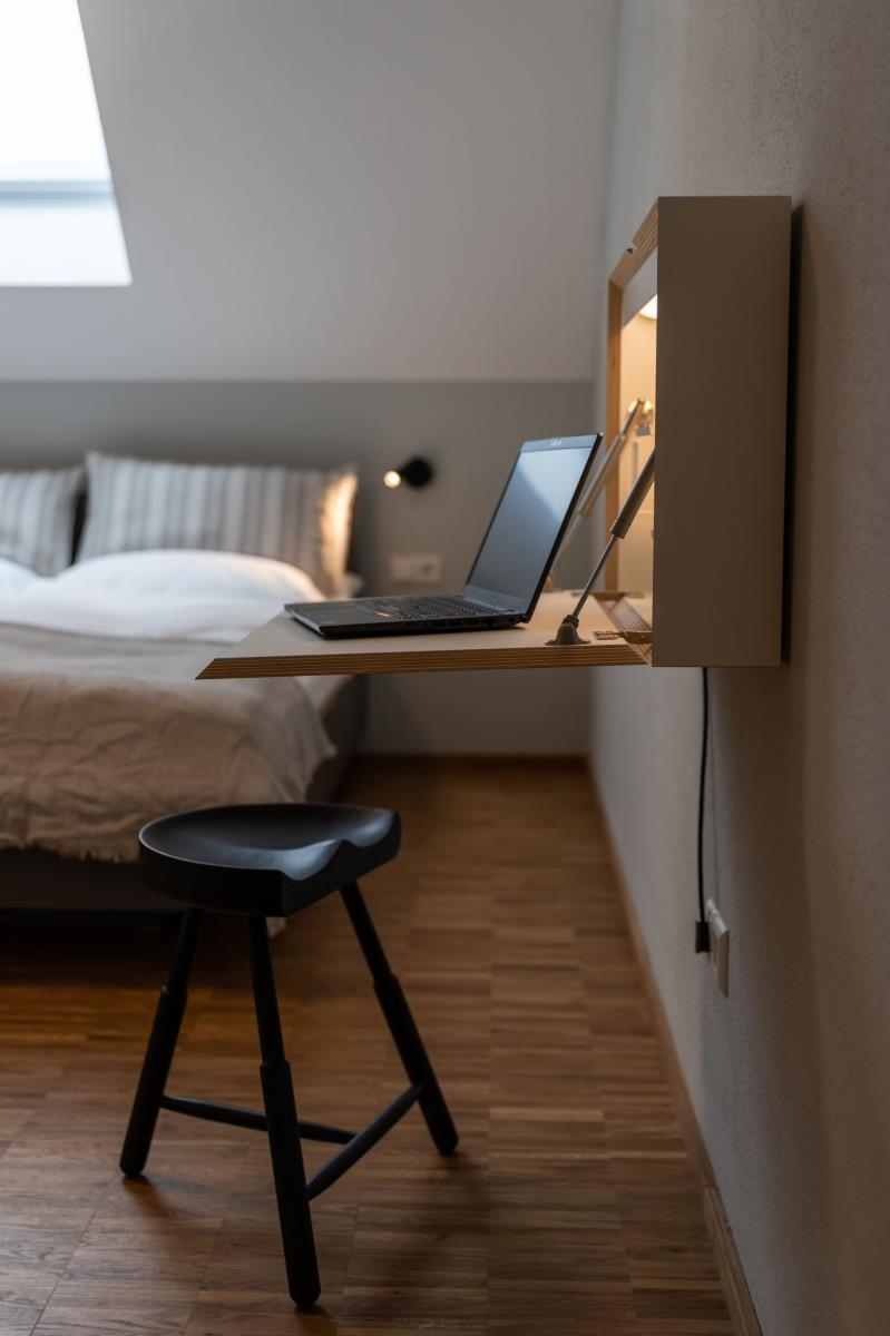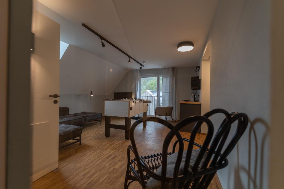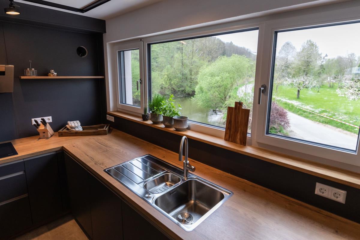 Location für geschäftliche Meetings und Seminare Inspirierende Natur, Entspannung in der Panoramasauna, gemeinsames Kochen in der hochwertigen Küche und Übernachten am Fluss. Buchen Sie dieses multifunktionale Businesshaus, zwei Tische am großen Flatscreen, W-LAN (HIGH-SPEED INTERNET Starlink von Elon Musk), Flipchart auf Vorbestellung, geräumige Küche für gemeinsames Kochen, 2 Miele Backöfen, 2 Spülmaschinen, 2 Kühlschränke, Weinkühlschrank, separater Aufenthaltsraum mit Tischkicker, traumhafter Außenbereich mit Dachterrasse, überdachte Veranda, Liegewiese und Zugang zum Fluss. Wir bieten einen Sonderpreis für die Buchung ausschließlich in der Wochenmitte. Sprechen Sie uns an. Jedes der sieben Schlafzimmer verfügt jeweils über ein Bad en Suite und über einen Wandsekretär von Müller Möbelwerkstätten.