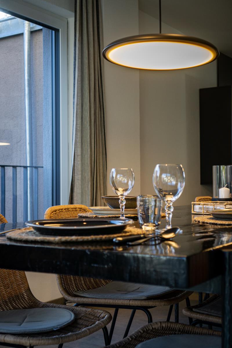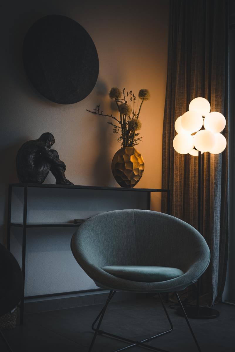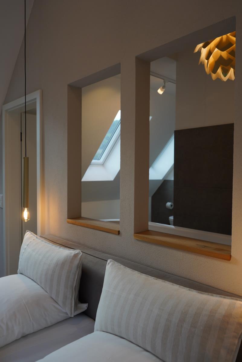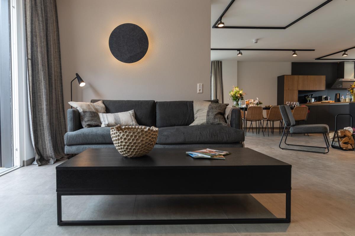 Im Zentrum steht ein großer, barrierefreier Raum, der in verschiedene Zonen aufgeteilt ist: ein Wohnbereich am Kamin, ein Wohnbereich am Panorama-Fenster, dem Koch- und Essbereich mit zwei langen Tischen für bis zu 16 Personen. Von hier aus gelangen Sie auf eine mit Glas überdachte Terrasse. Alle Schlafräume verfügen über einen Wandsekretär von Müller Möbelwerkstätten.