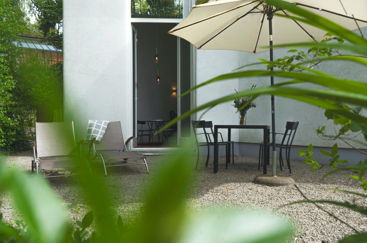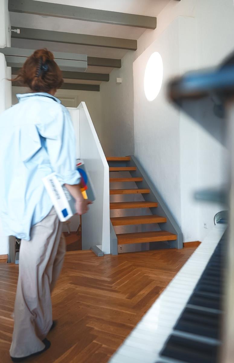 Hohe Decken, große Fenster – da kann die Seele entspannen. Schlafen unterm Bullauge mit Blick in den Garten, hochwertiges Parkett, vom Schreiner gefertigte Küche, hochwertige Möblierung von Jan Kurtz & Rolf Benz, Flügel, eingezäunter Garten, gemauerter Kamin. Der Flügel dient der Dekoration und ist nicht gestimmt.
