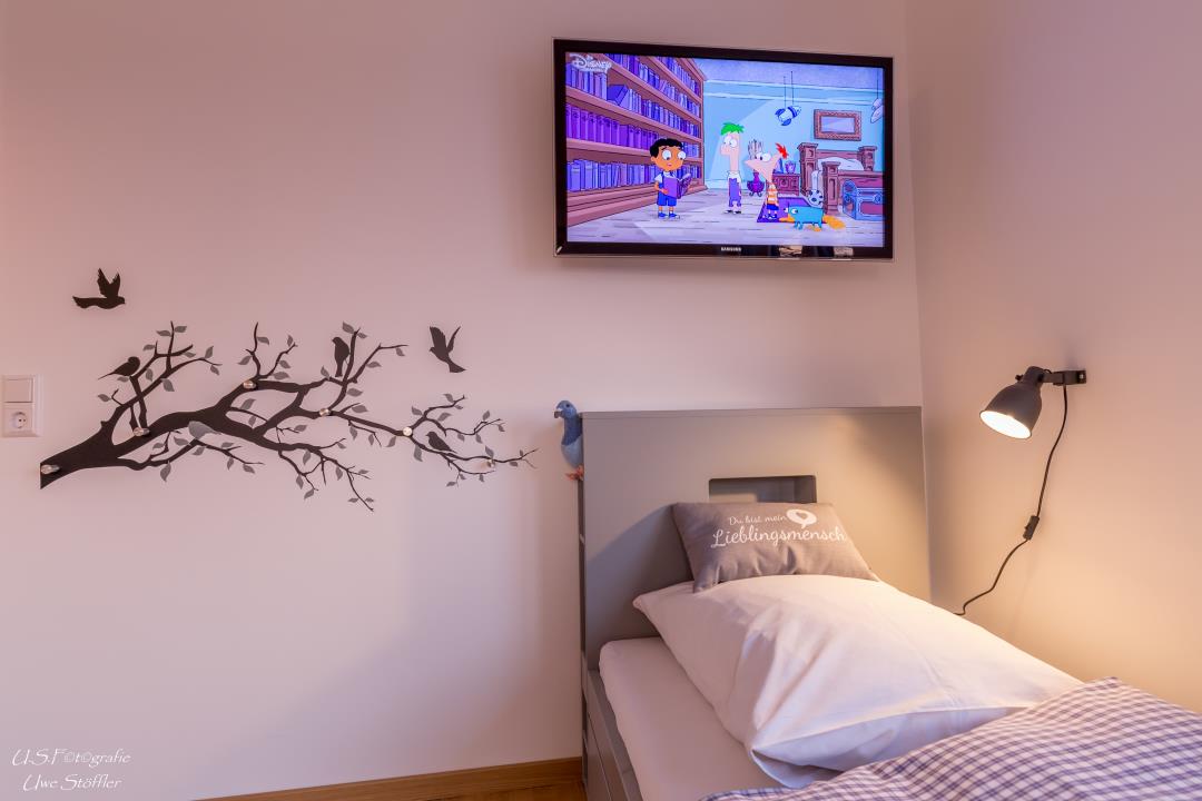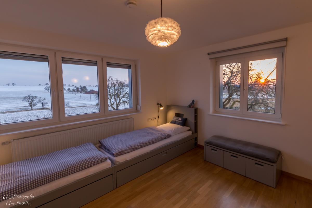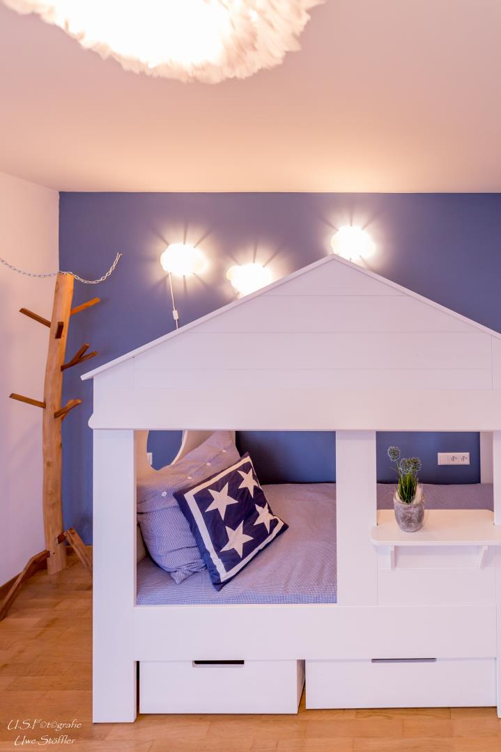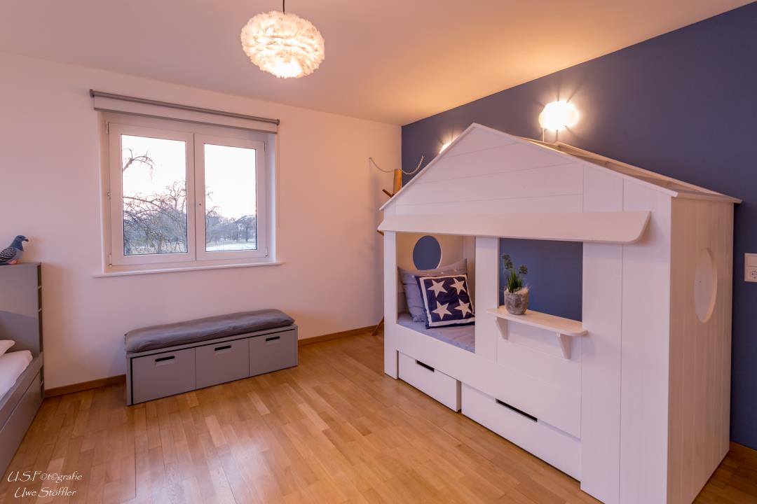 Kinderschlaf/Spiele-Zimmer mit einem 2 Kinderbetten (2x 90x200) und dem Hausbett 90x200. Außerdem wären die 2 Kinderbetten erweiterbar um 2 Auszugbetten, so dass wir im Kinderbett auf 5 Schlafplätze kämen.