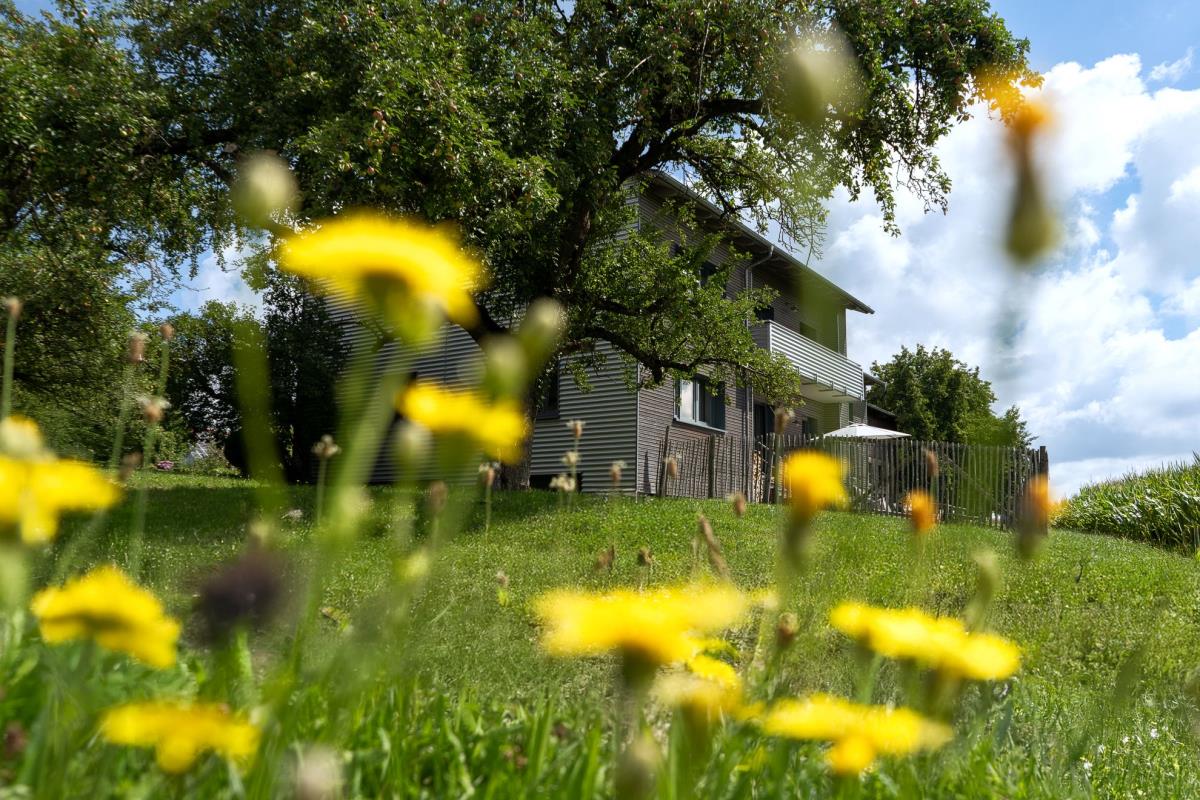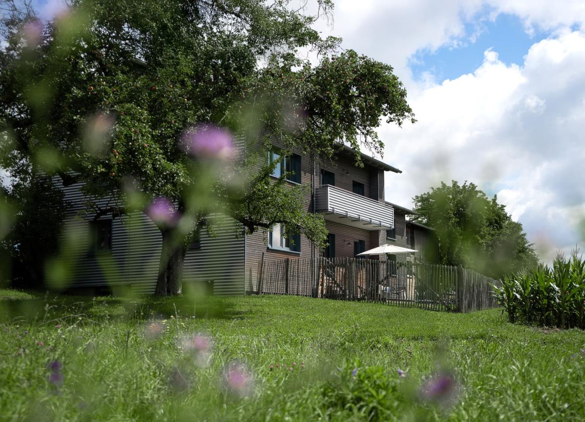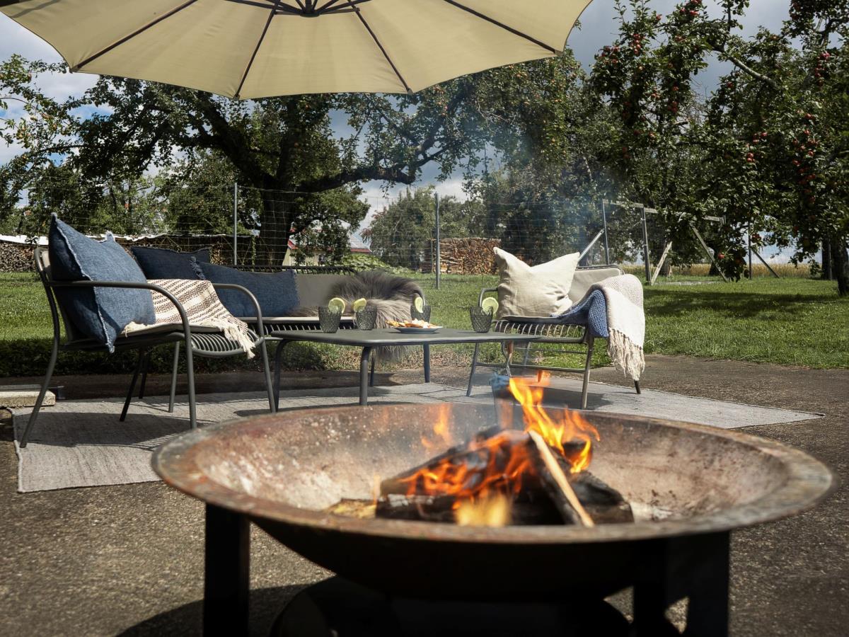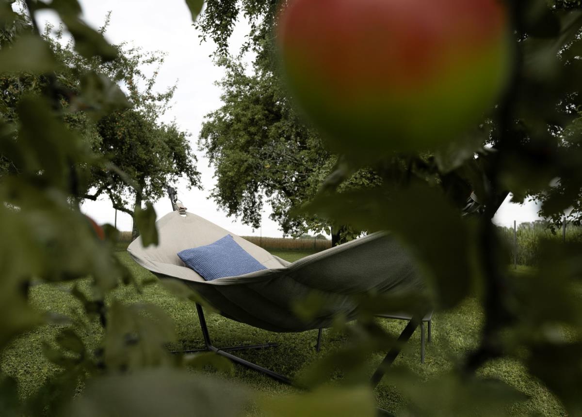 Schon beim Eintreten öffnet sich der Blick: Vom Wohnbereich geht es hinaus auf die Holzveranda, von der aus man Wiesen und Felder überblickt. Im 1.500 m² großen, 1,50 m hoch eingezäunten Garten haben Hunde Freiheit und Sicherheit zugleich, während Kinder zwischen alten Obstbäumen herumtollen.