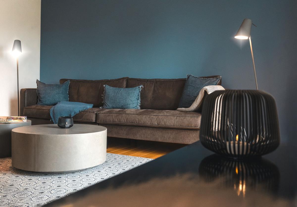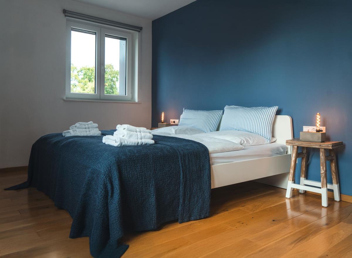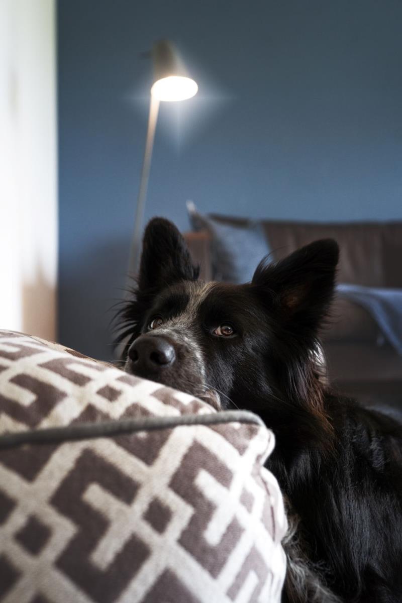 Klare Linien und helle Wände bilden die Basis, Taubenblau und Grau setzen sanfte Akzente. Außen treffen Holzverschalung und Stahlblech auf die Natur, innen sorgen skandinavische Möbel und viel Licht für Leichtigkeit. Ein Ambiente, das Ruhe und Wärme schenkt – für Zwei- und Vierbeiner.