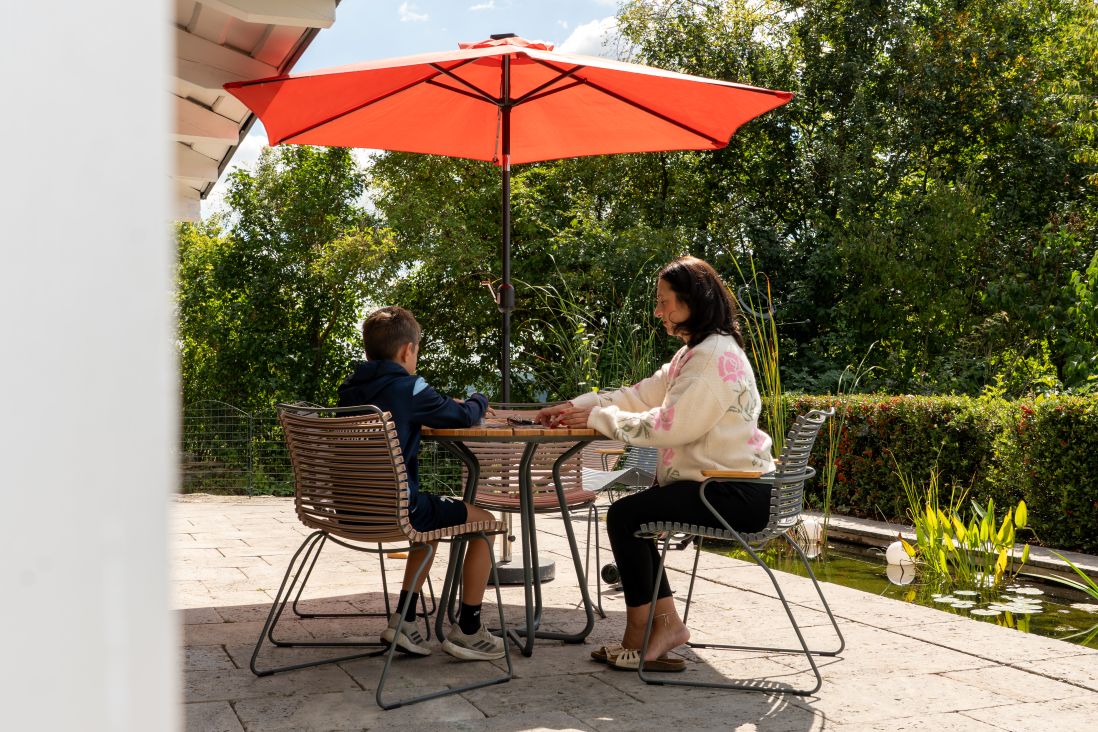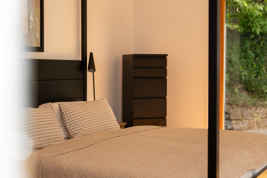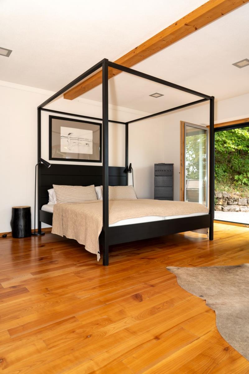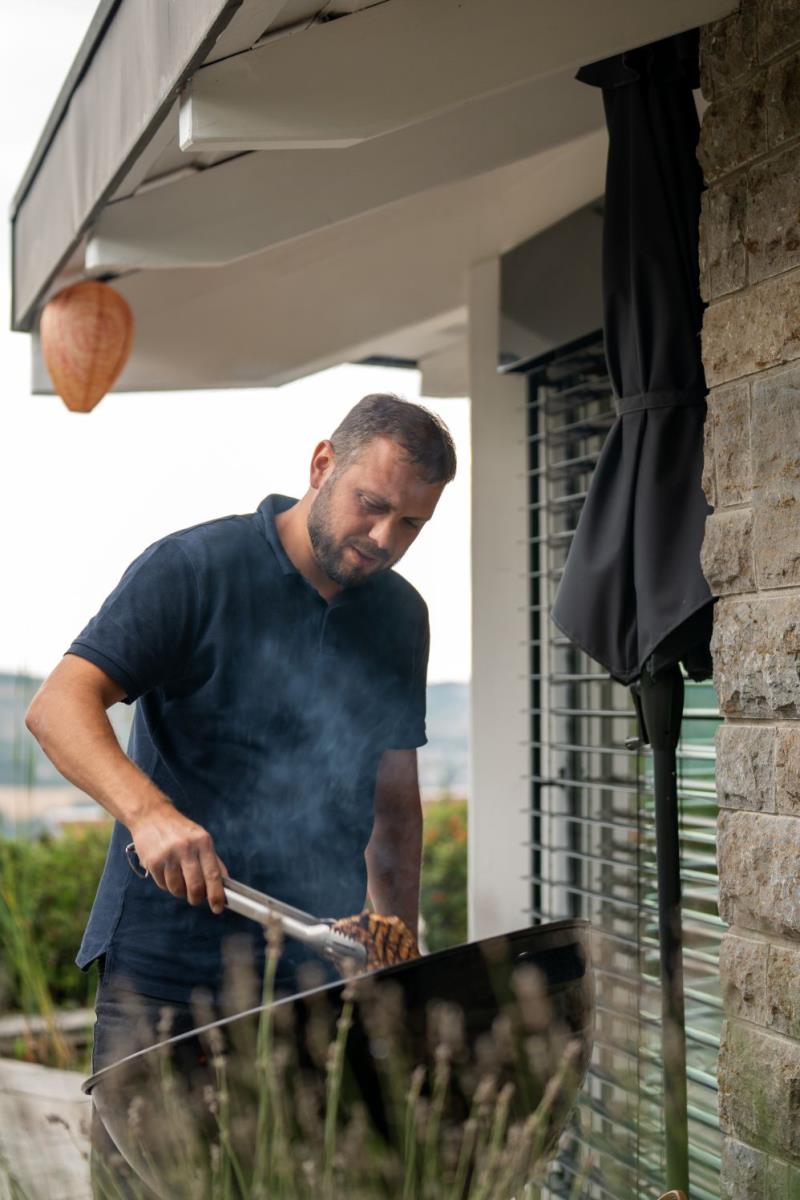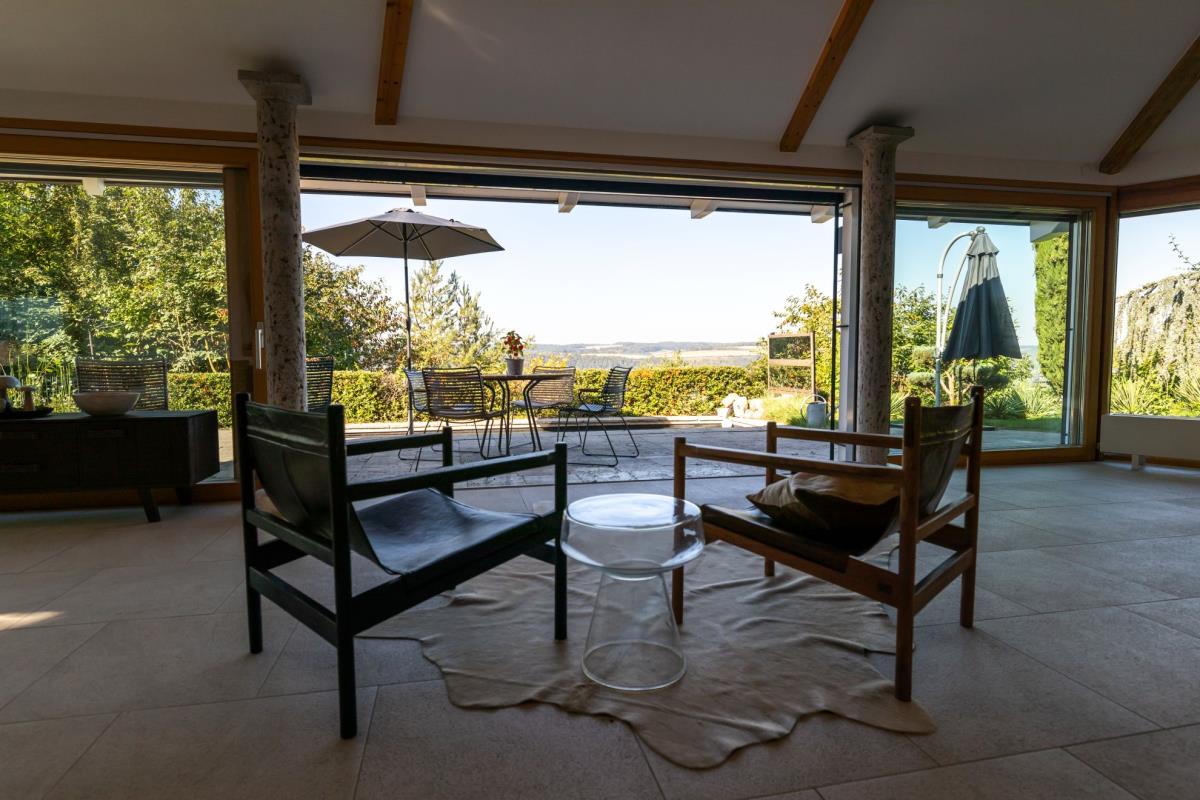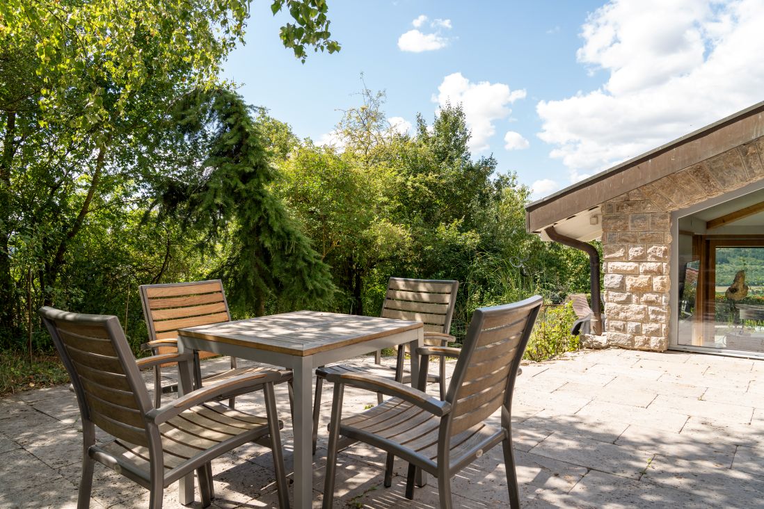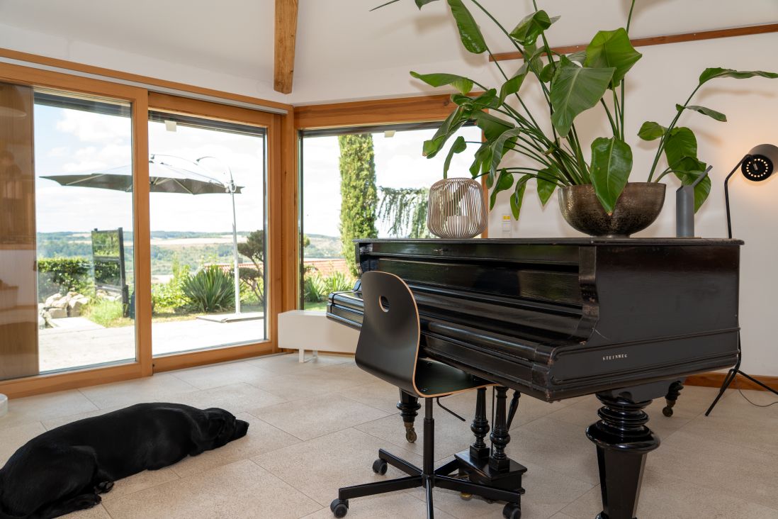 Hoch über dem Taubertal, mit fantastischem Weitblick über die Kulturlandschaft Tauberfrankens liegt dieses freistehende Ferienhaus inmitten eines 2000qm großen mediterran anmutenden Gartens. Entspannt Urlaub mit Hund, denn der Garten ist 1,4m hoch umzäunt. Im Garten sind gleich mehrere Ruheplätze verteilt, die Ecken zu Oasen machen. Ein Highlight ist die 50m² große Dachterrasse. Hier ist man dem Himmel ganz nah. Eine Idylle - Umgeben vom „hauseigenen" Kiefernwald mit historischen Steinriegeln - überall duftet Lavendel. Im Haus finden sich hohe Decken, große Fenster, offene Räume – da kann die Seele entspannen. Für kleine Kinder ist das Ferienhaus nur bedingt geeignet. Der Flügel dient der Dekoration und ist nicht gestimmt.