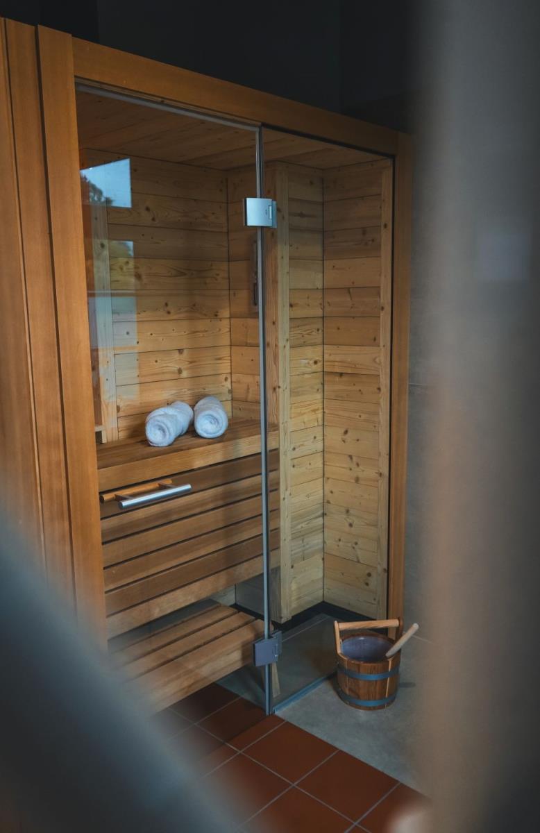 Für Entspannung sorgen die Sauna für zwei Personen sowie der Hot Tub im Garten, wo Wellness und Naturerlebnis harmonisch ineinanderfließen.