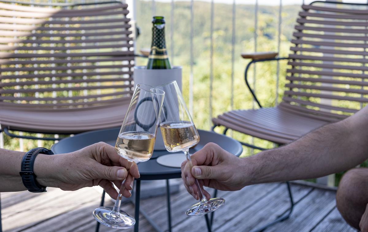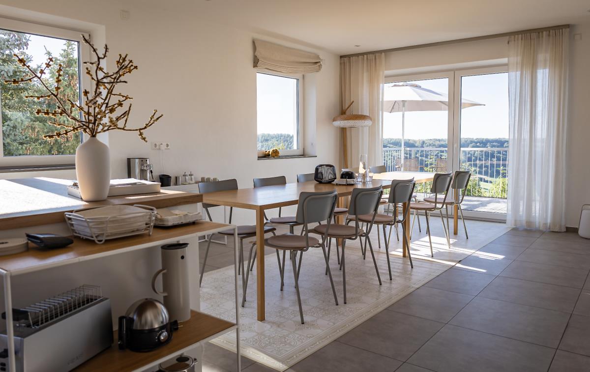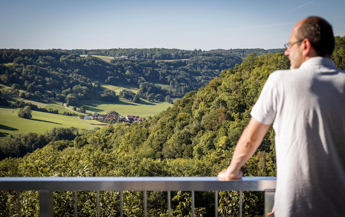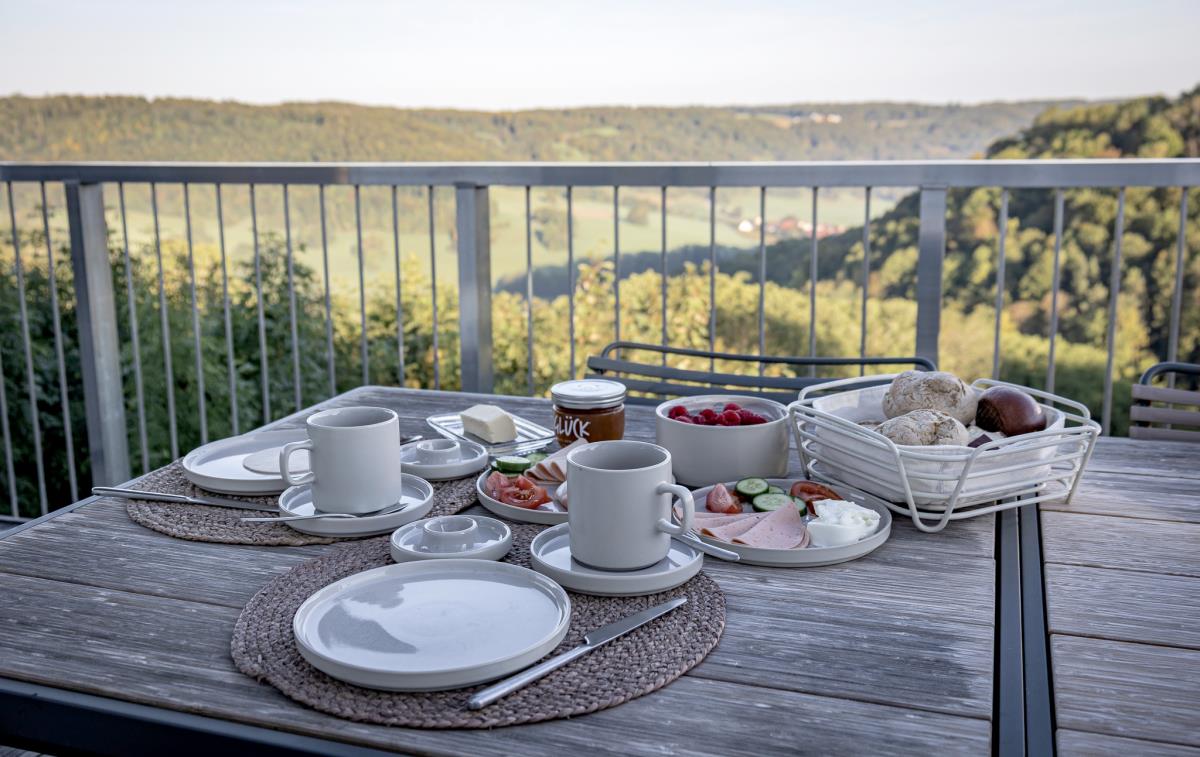 Hier finden bis zu 12 Personen (inklusive Kleinkinder und Babys) viel Platz für gemeinsame Zeit, Entspannung und Erlebnisse. Atemberaubende Terrassen schweben über den Baumwipfeln des Jagsttals – perfekt, um den Blick schweifen zu lassen oder unvergessliche Sonnenuntergänge zu genießen.