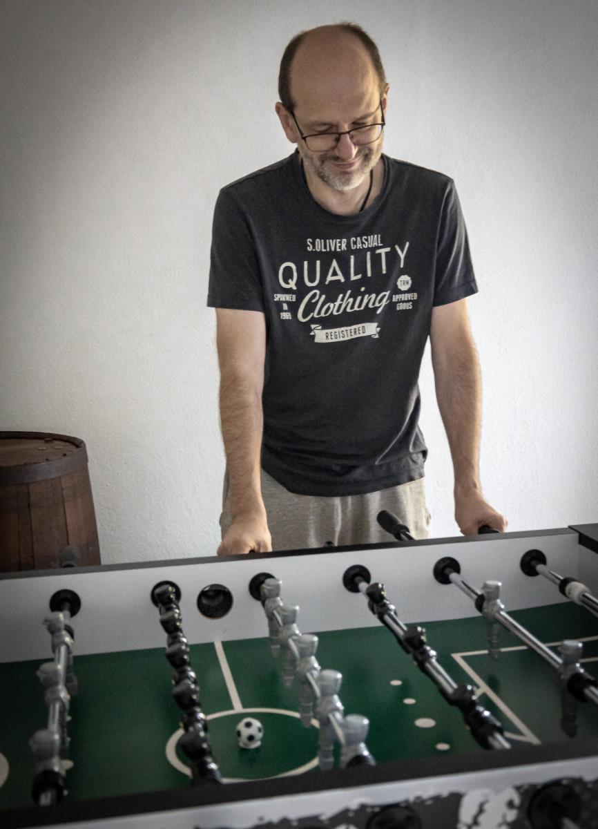 Im großzügigen Gemeinschaftsraum kommt Stimmung auf: Beim Kickern können Groß und Klein ihr Können unter Beweis stellen – ideal für gesellige Abende.