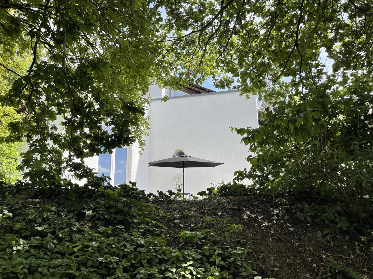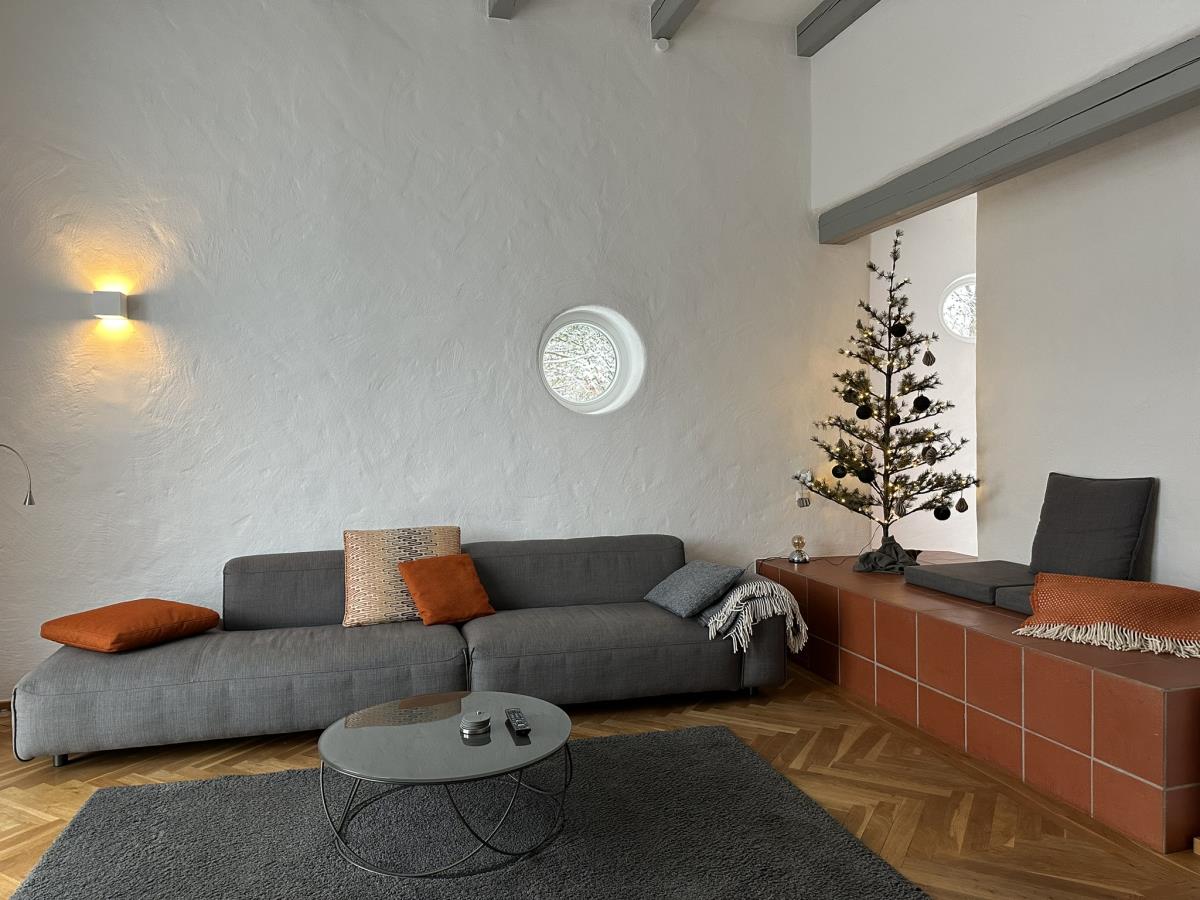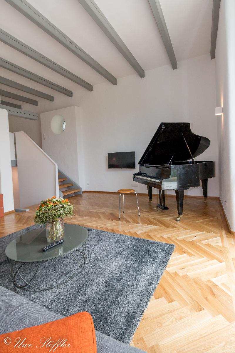 Hohe Decken, große Fenster – da kann die Seele entspannen. Schlafen unterm Bullauge mit Blick in den Garten, hochwertiges Parkett, vom Schreiner gefertigte Küche, hochwertige Möblierung von Jan Kurtz & Rolf Benz, Flügel, eingezäunter Garten, gemauerter Kamin. Der Flügel dient der Dekoration und ist nicht gestimmt.