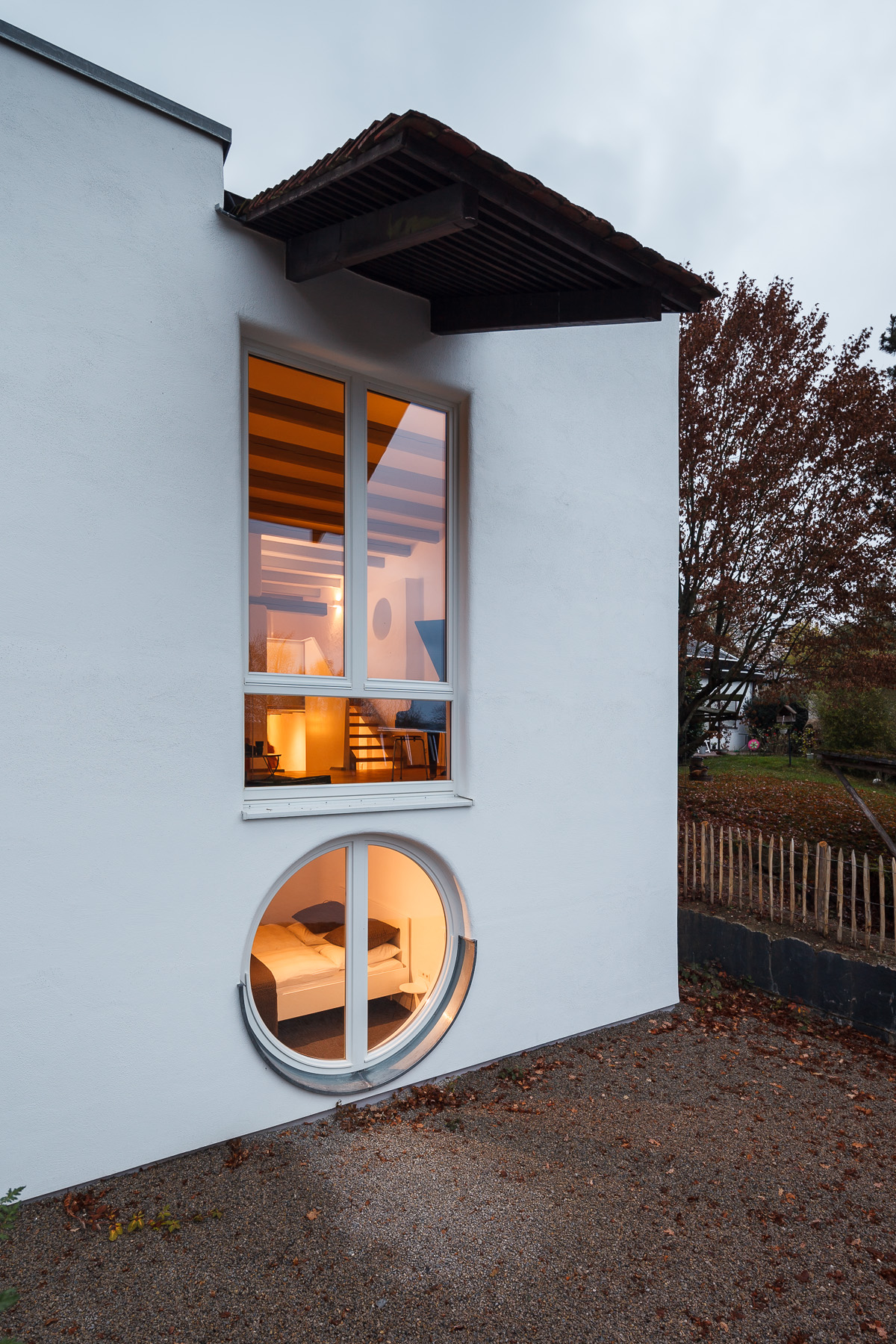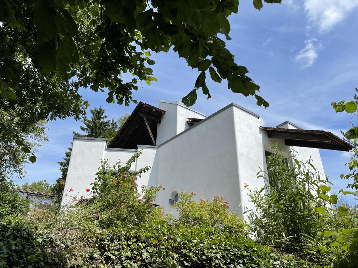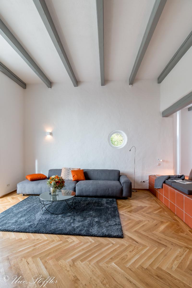 Hohe Decken, große Fenster – da kann die Seele entspannen. Schlafen unterm Bullauge mit Blick in den Garten, hochwertiges Parkett, vom Schreiner gefertigte Küche, hochwertige Möblierung von Jan Kurtz & Rolf Benz, Flügel, eingezäunter Garten, gemauerter Kamin. Der Flügel dient der Dekoration und ist nicht gestimmt.